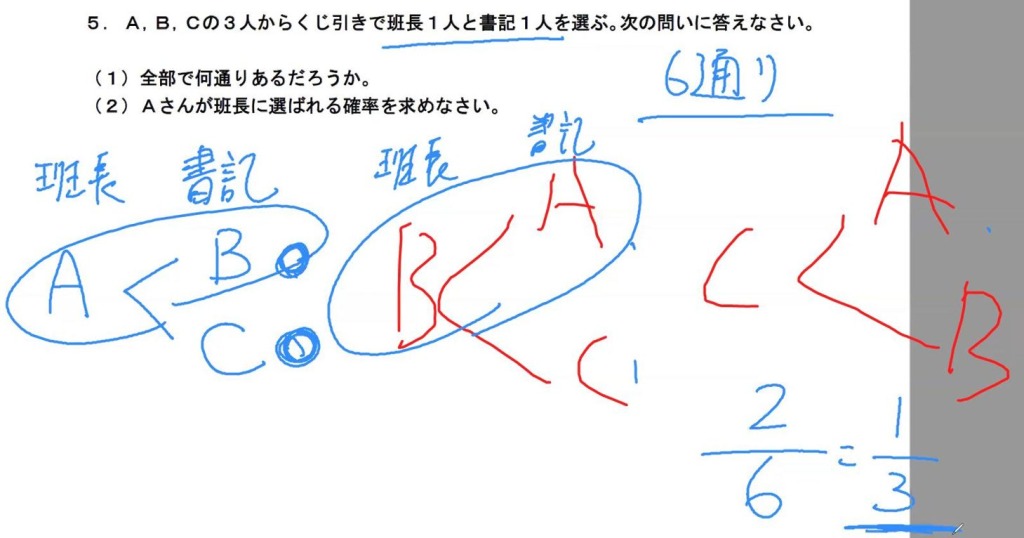 A,B,Cの3人からくじ引きで班長1人と書記1人を選ぶ。